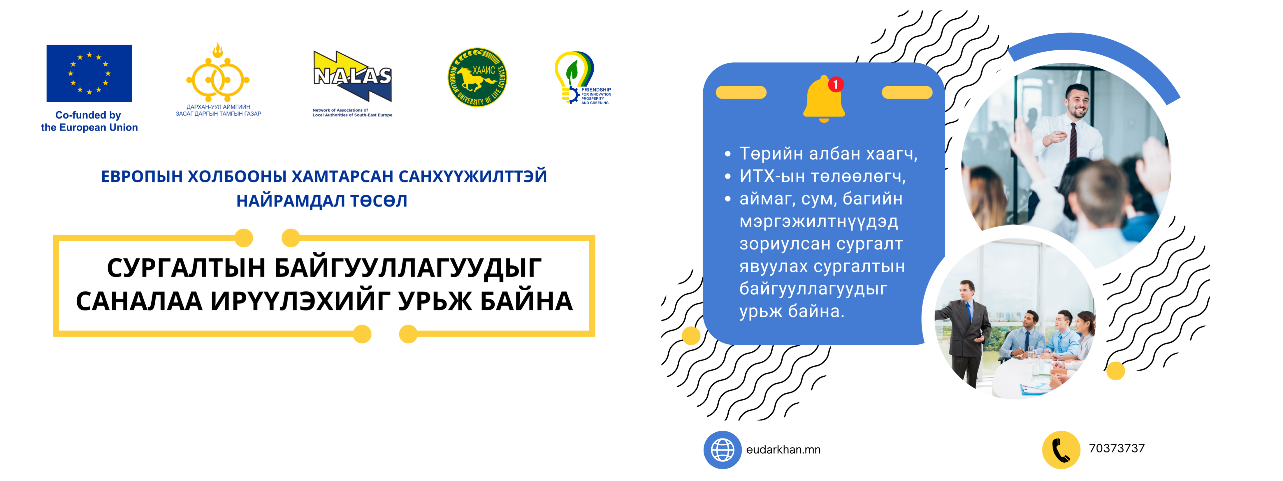 - Дархан-Уул аймгийн төрийн албан хаагчид, иргэдийн төлөөлөгчдийн хурлын төлөөлөгч, аймаг,сум,багийн мэргэжилтнүүдийг чадавхжуулах сургалтыг явуулах эрх бүхий байгууллага, баг нь хүний нөөцийн чадамж бүхий мэргэшсэн байх