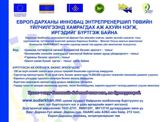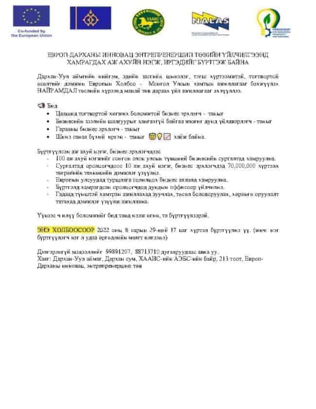ДАРХАН-УУЛ АЙМГИЙН ЗАСАГ ДАРГЫН ТАМГЫН ГАЗАР БОЛОН ЕВРОПЫН ХОЛБООНЫ САНХҮҮЖИЛТТЭЙ НАЙРАМДАЛ ТӨСӨЛ, ХӨГЖЛИЙН ШИЙДЭЛ ТББ ХАМТРАН ДАРХАН-УУЛ АЙМГИЙН “ХӨРӨНГӨ ОРУУЛАЛТЫН ФОРУМ”-ЫГ 2023 ОНЫ 06 ДУГААР САРЫН 29-НЫ ӨДРӨӨС 07 ДУГААР САРЫН 01-НИЙ ӨДРҮҮДЭД ЗОХИОН БАЙГУУЛАХААР ТӨЛӨВЛӨЖ БАЙНА.